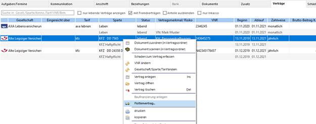 Dazu wählen Sie die Verträge des Kunden an, auf welche die Fahrzeugdaten übertragen werden sollen.