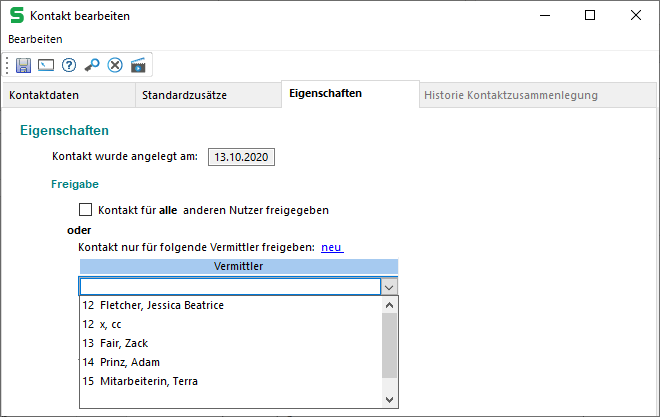Standardmäßig wird der Kontakt für alle Vermittler freigegeben. Wollen Sie ihn nur für einige Vermittler freigeben, dann deaktivieren Sie das Feld und gehen auf „neu“. Damit wird in der Liste „Vermittler“ ein neuer Eintrag vorgenommen.