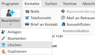 Neben dem Aufruf der Funktion "Kontakt löschen" über das Menü steht Ihnen sowohl im Kontaktdatenbereich des Startfensters als auch im Suchfenster für Kontakte/Verträge ein entsprechender Kontextmenü - Eintrag zur Verfügung.
