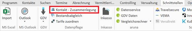 Die Möglichkeit der Zusammenlegung von Kontakten kann über das Menü Schnittstellen -> Kontakt-Zusammenlegung oder über die Kontaktsuche (z.B. bei ähnlichen Namen) aufgerufen werden.