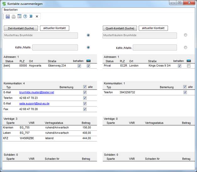 Handelt es sich bei der Quellperson um einen Kontakt, der von einem anderen Besitzer für die Bearbeitung freigegeben wurde, werden ausschließlich seine Dokumente, Verträge und Schadensfälle an die Zielperson übertragen. Die Quellperson bleibt dann mit ihren Adress- und Kommunikationsdaten, Beziehungen und Interessen weiterhin im System erhalten.