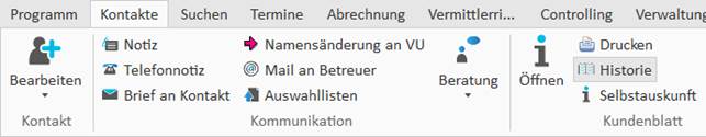 Neben dem Aufruf der Kundenhistorie über das Menü kann der Wechsel zu dieser Funktion auch über die entsprechende Schaltfläche im ExpressMenü in der Gruppe „Kontakte“ erfolgen.
