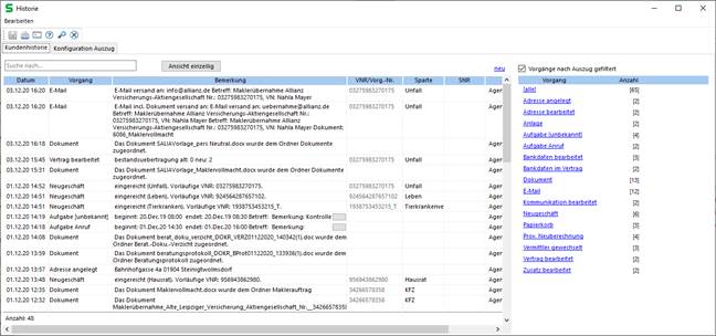 alle automatisch angelegten Historieneinträge ist ausschließlich die Spalte Sparte " zur