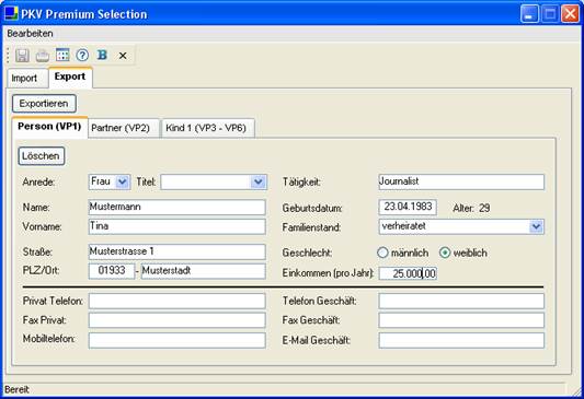 Die Schnittstelle zu PKV Premium Selection ist ein Bezahlmodul. Der Menüpunkt ist nur aktiv, wenn PKV Premium Selection auf dem Rechner installiert ist. Hersteller der Software ist Volz-ITSC-Software.