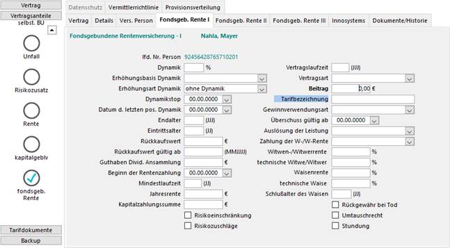 Angaben zu Fondsgebundene Lebensversicherungen werden in den Karteireitern Fondsgeb. Rente I bis Fondsgeb. Rente III erfasst.