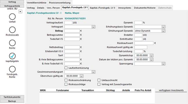 Angaben zu Kapital- und Fondsgebundene Lebensversicherungen werden in den Karteireitern Kapital- / Fondsgeb. LV I und Kapital- / Fondsgeb. LV II erfasst.