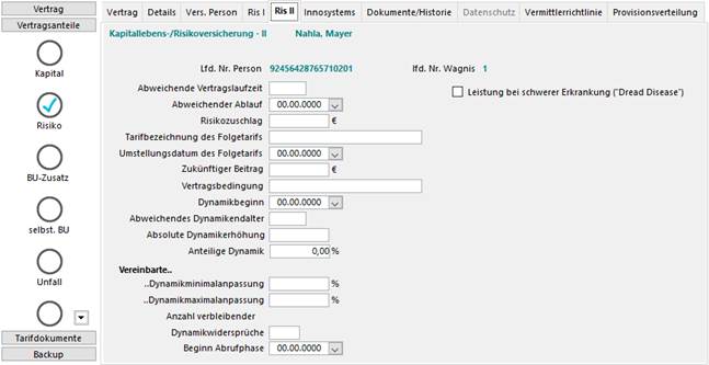 In diesem Karteireiter werden weitere Vertragsanteile zu Kapitallebensversicherungen und Risikoversicherungen erfasst.