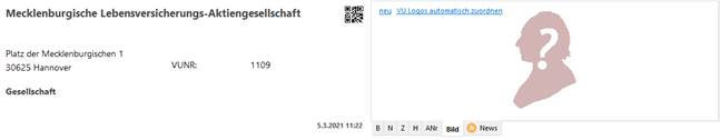 Rufen Sie in den Kontaktdaten das Versicherungsunternehmen auf, für das Sie ein Logo hinterlegen wollen. Wechseln Sie dann in den Karteireiter „Bild“ der Allgemeinen Kontaktdaten und Klicken Sie auf „VU Logos automatisch zuordnen“. Ist ein Logo verfügbar, so wird es an dieser Stelle angezeigt.