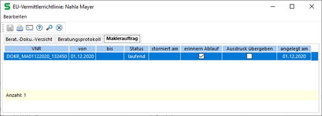 Der Maklerauftrag ist die dritte Karteikarte des Fensters für EU-Vermittlerrichtlinien. Sie erreichen sie, indem Sie eine der beiden anderen Vermittlerrichtlinien aufrufen, und danach auf die Karteikarte "Maklerauftrag" wechseln.