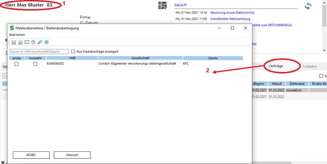 | 2 | Verträge des aktuellen Kontaktes finden sich in der Liste des Fensters MÜ / BÜ |