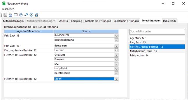 Um einem Vermittler dieses Recht zuzuweisen, wählen Sie ihn aus der Mitarbeiterliste per Doppelklick aus. Dadurch wird sein Name in die Berechtigungstabelle übertragen. Nun kann in der Spalte „Sparte“ die Versicherungssparte ausgewählt werden, für die der Vermittler Provisionsbuchungen durchführen soll. Um dem Vermittler dieses Recht für eine weitere Sparte zuzuweisen, wiederholen Sie den Vorgang einfach, indem Sie diesen Mitarbeiter erneut in der Mitarbeiterliste auswählen. Dadurch wird ihm in der Spalte „Sparte“ ein weiteres Feld zugeordnet, das nun aktualisiert werden muss.