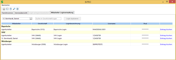 Auf dieser Übersicht wird dem Agenturleiter ermöglicht, alle Logins der Mitarbeiter zu verwalten. Es können bereits vorhandene Logins gelöscht, dupliziert, einem Mitarbeiter zugewiesen oder weggenommen, umbenannt, Nutzername/Passwort angepasst werden. Es kann nach Gesellschaften, Login-Bezeichnungen oder Mitarbeitern gefiltert werden. Jede Änderung wird erst gespeichert, wenn man entweder auf einen anderen Tab wechselt oder wenn man auf das Speichern-Symbol klickt.