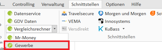 Der Aufruf der Schnittstelle erfolgt, wie gewohnt, über [Schnittstellen] - [Vergleichsrechner] – [Gewerbe]. Falls unter dem hinterlegten aruna Login mehr als ein Gewerbe 24 Login geschlüsselt ist, öffnet sich ein Fenster mit der Auswahl der Vermittlernummern.