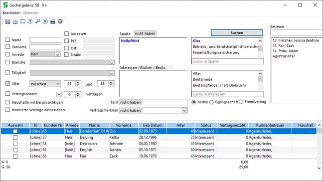 Diese Suchfunktion ermöglicht Ihnen die Suche nach Kunden, die potenziell für bestimmte Versicherungssparten in Frage kommen.