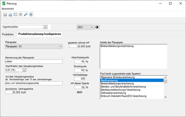 Sparten aus der Liste „Pool (nicht zugeordnete reale Sparten)“ werden per Doppelklick in die Liste „Anteile der Plansparte“ übernommen.