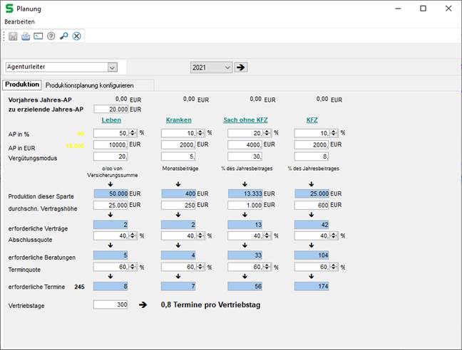 SALIA® gibt Ihnen die Möglichkeit, die Umsatzentwicklung der Sparten, die dafür erforderliche Anzahl an Verträgen und die dafür aufzuwendenden Termine, in Abhängigkeit der erwarteten Provisionen und des Vergütungsmodus für das folgende Jahr zu planen.