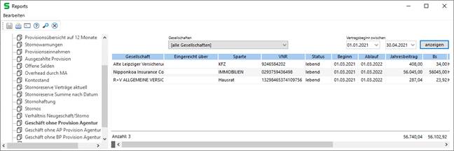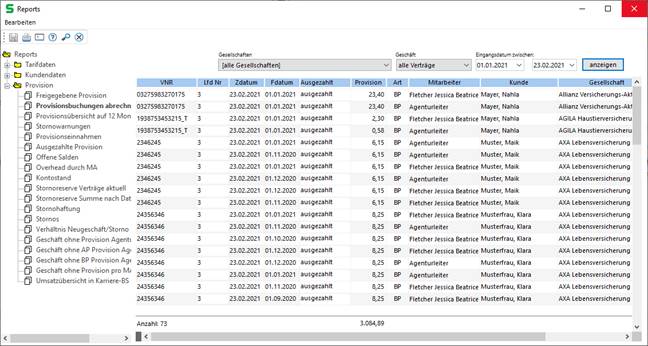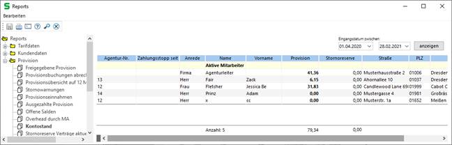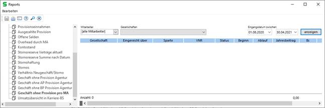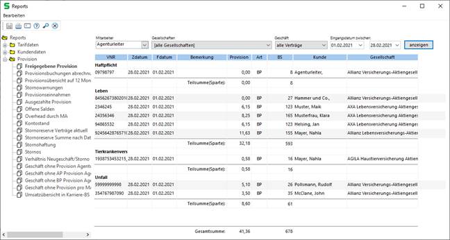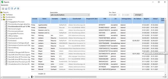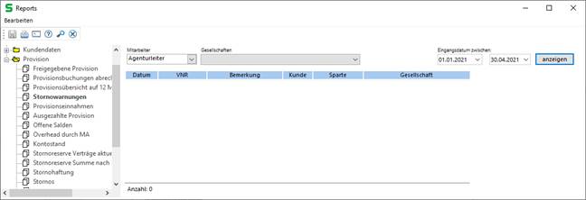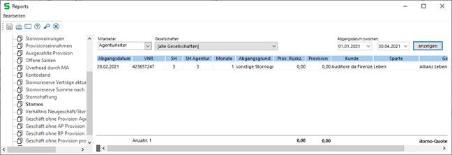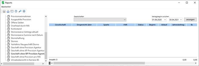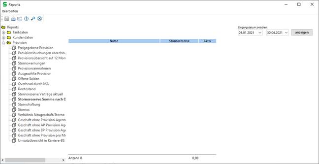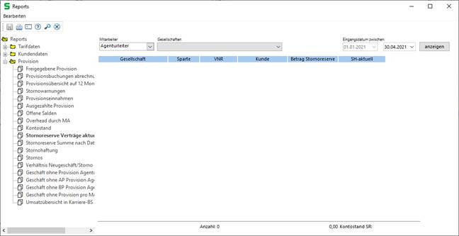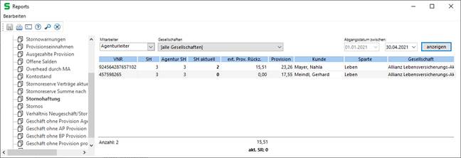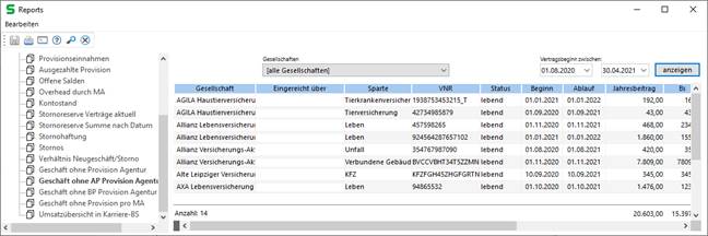 Im Report Stornohaftung werden Angaben über die Höhe der Stornohaftung und der eventuellen Provisionsrückzahlungen aller Verträge gemacht, die im ausgewählten Zeitraum der Stornohaftung unterliegen.