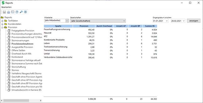 Die Übersicht über Provisionseinnahmen gibt Auskunft über die eingenommenen Provisionen der einzelnen Sparten und deren Anteile an Bestandspflege und Vertragsabschluss.