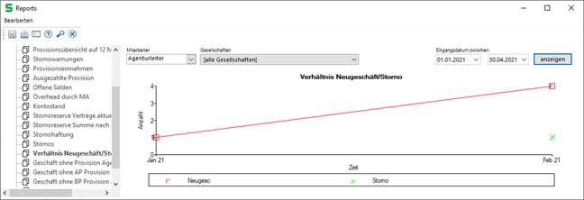 Der Bericht Verhältnis Neugeschäft/Storno gibt noch eine allgemeine grafische Darstellung dazu, wie sich Vertragsabschlüsse zu Vertragsstornierungen verhalten.