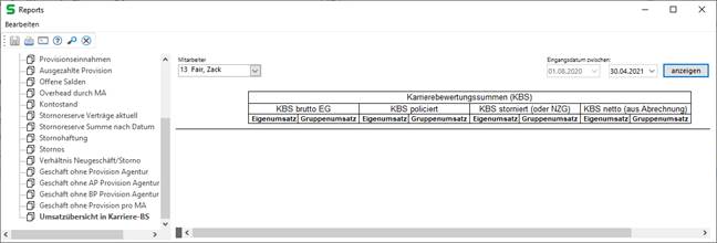 Der Bericht Umsatzübersicht in Karriere-BS zeigt eine Übersicht der Karrierebewertungssummen (KBS) wenn dieses Bewertungssystem in SALIA® genutzt wird.