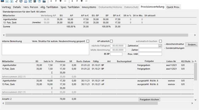 Jeder Mitarbeiter erhält in dieser Karteikarte einen Überblick über die zum Vertrag berechnete Provision. Darüber hinaus erhält er Auskunft über alle bereits erhaltene Provisionszahlungen für den aktuellen Vertrag.