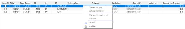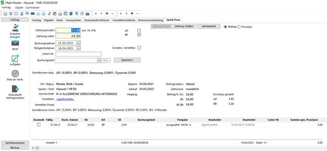 Die Quick Prov Tabpage wird dann in Verträgen oder unter Fällige Provisionen angezeigt.