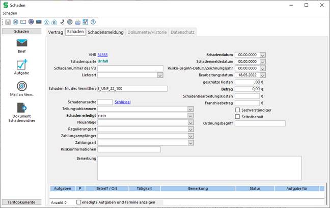 Beispiel-Tabpage "Schaden" einer Unfallversicherung