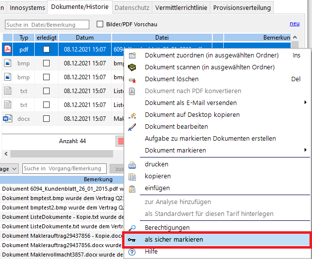 Sollen mehrere Dokumente auf einmal als sicher markiert werden, kann das in der Dokumentensuche umgesetzt werden.