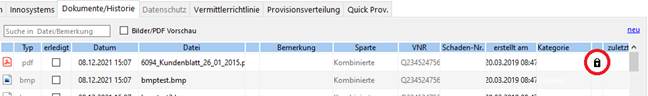 Ein gesichertes Dokument wird durch ein Schloss in der äußersten Spalte auf der rechten Seite kenntlich gemacht.