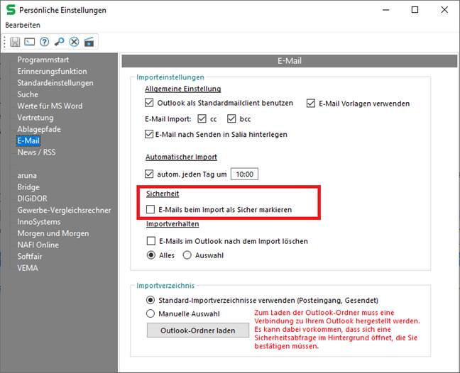E-Mails können bereits beim Import als sicher markiert werden. Aktivieren Sie dazu in den Persönlichen Einstellungen den Punkt „E-Mails beim Import als Sicher markieren“.