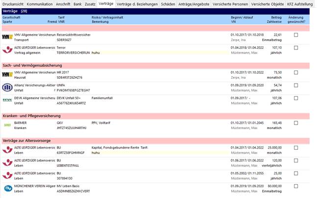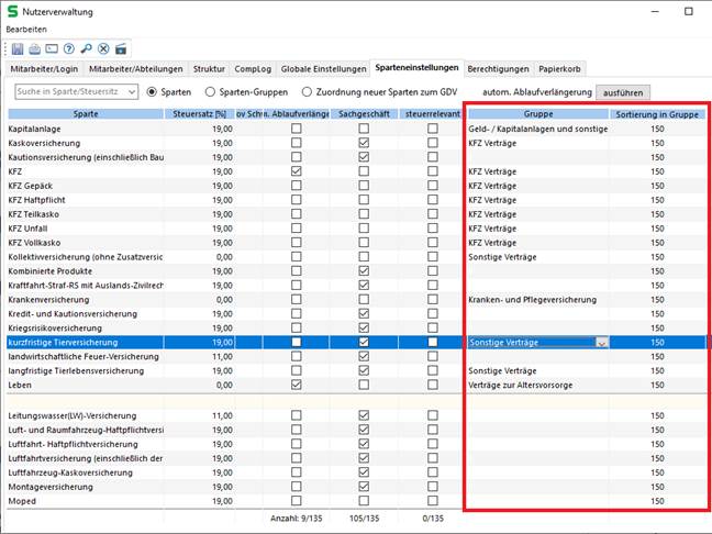 Mit Hilfe der Sparten-Gruppen können Sie die Ansicht der Verträge im Kundenblatt beeinflussen.