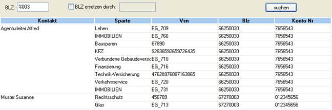 Das Suchergebnis sind alle VSN mit Angabe der Sparte und des zugehörigen Kontaktes, die auf diese BLZ laufen.