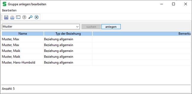 Darüber hinaus können auch weitere Personen zu einer bereits bestehenden Gruppe zugeordnet werden. Dazu wählen Sie die Schaltfläche „suchen“, um die Werteliste "Gruppenbezeichnung" zu füllen. Wählen Sie nun die gewünschte Gruppe aus, wird die ausgewählte Gruppe erweitert.