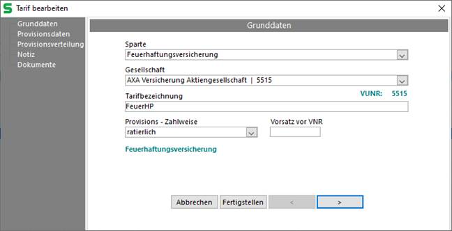 Hier können nun die Daten zu dem neuen Tarif erfasst werden.