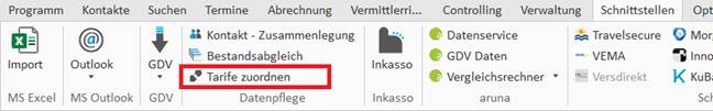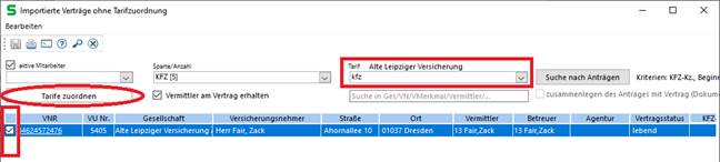 Markieren Sie den zu bearbeitenden Vertrag und wählen Sie aus der Werteliste „Tarif“ den Tarif aus, der dem Vertrag zugeordnet werden soll. Die Zuordnung wird ausgeführt, sobald Sie die Schaltfläche „Tarife zuordnen“ betätigen.