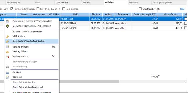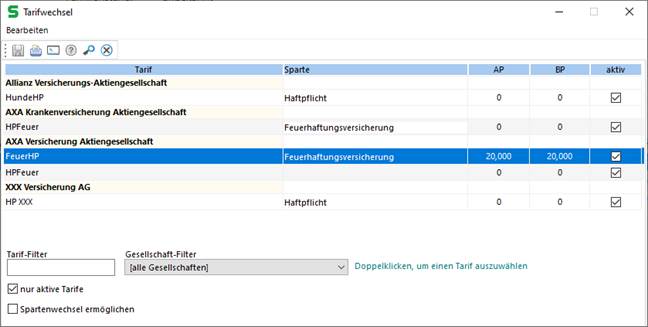 Der Wechsel erfolgt durch Doppelklick auf den entsprechenden Tarif. Gehört der neue Tarif einer anderen Sparte an, muss „Spartenwechsel ermöglichen“ am unteren Fensterrand aktiviert werden.