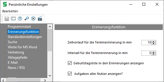Ist das Feld "Erinnerungsfunktion" aktiviert, werden Sie entsprechend Ihrer persönlichen Einstellungen vor Beginn des Termins durch das SALIA® - System erinnert. Darüber hinaus wird der Termin in die Erinnerungsliste übernommen.