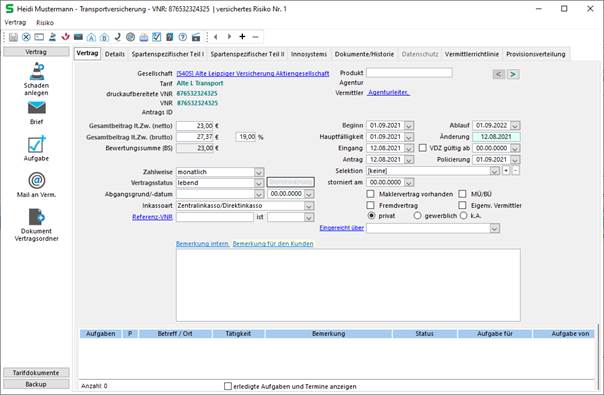 Die Transportversicherung kann mehrere Risiken einschließen. Über die Schaltflächen "+" und "-" können dem Vertrag neue Risiken zugeordnet - oder bereits zugeordnete Risiken wieder entfernt werden.