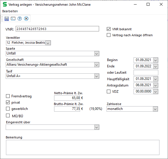 Hinweis: Der Tarif muss vorhanden sein, um einen entsprechenden Vertrag anlegen zu können.