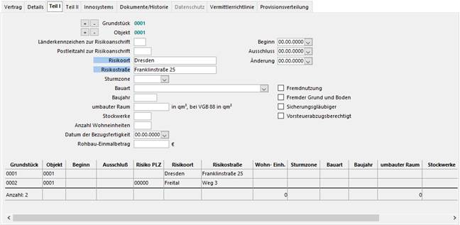 Die Risikoanschrift für Gebäudeversicherungen wird in „Teil I“ hinterlegt.