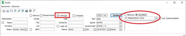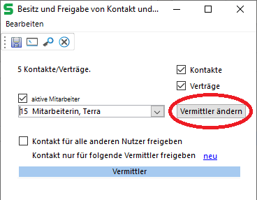 Die Liste der aktiven Mitarbeiter wird über die Schaltfläche Vermittler ändern freigeschalten. Darüber wird angezeigt, wie viele Kontakte/Verträge ausgewählt wurden.