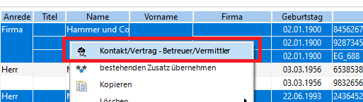 Über Rechtsklick wechseln Sie in das Kontextmenü und wählen „Kontakt/Vertrag – Betreuer/Vermittler“ aus.