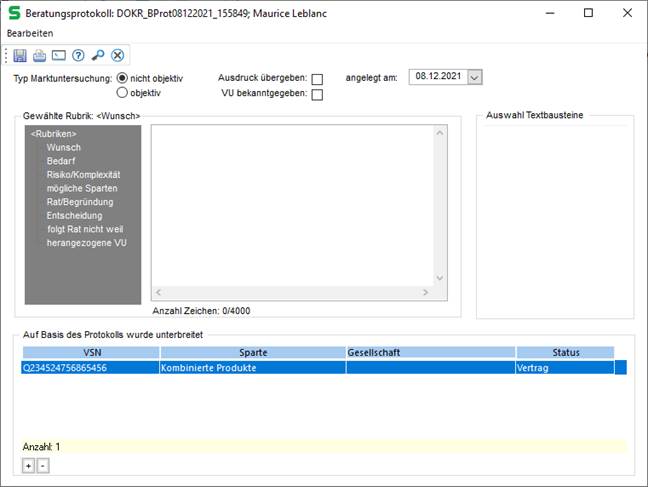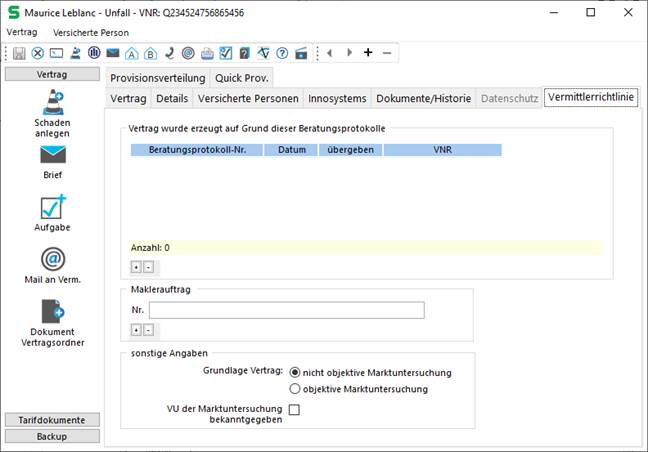 Diese Karteikarte enthält alle dem Vertrag zugrunde liegenden Beratungsprotokolle und den zugrunde liegenden Maklerauftrag.