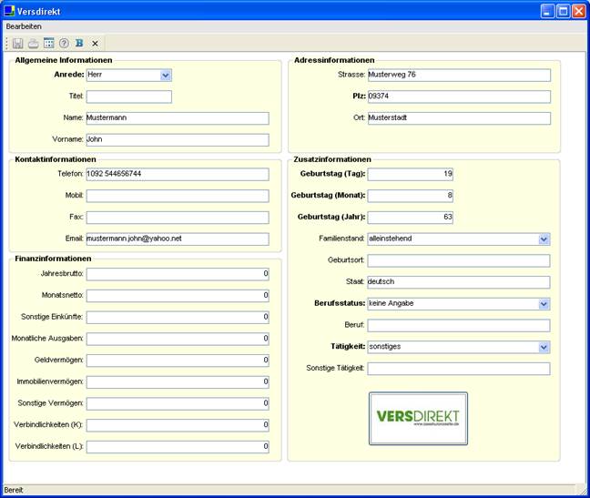 An den Vergleichsrechner werden Kontaktinformationen übermittelt. Des Weiteren können Finanzinformationen per Hand eingetragen werden.