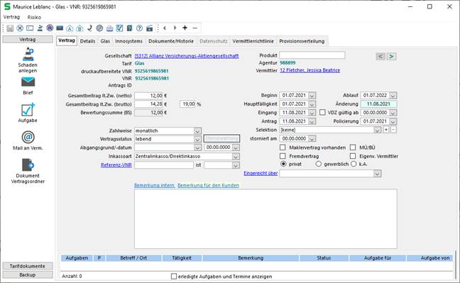 Die Glasversicherung kann mehrere Risiken einschließen. Über die Schaltflächen "+" und "-" können dem Vertrag neue Risiken zugeordnet - oder bereits zugeordnete Risiken wieder entfernt werden.