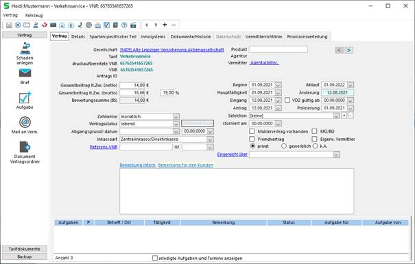 Ansicht des Vertragsfensters Verkehrsservice