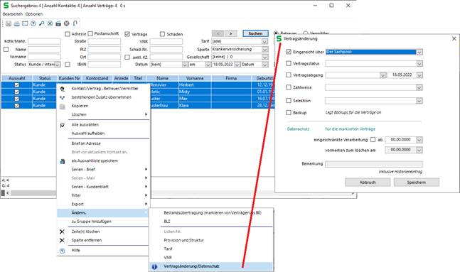 • Vertragsabgang + Abgangsdatum für mehrere Verträge auf einmal geändert werden,